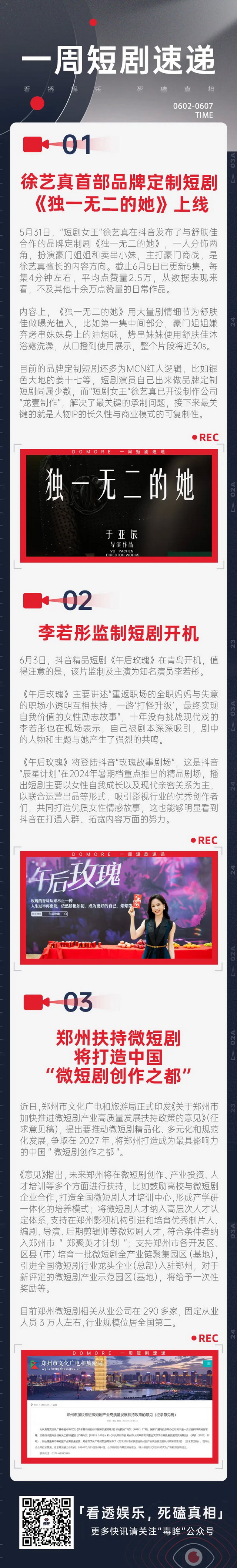 对于短剧产业的扶持本周也在继续。郑州市文化广电和旅游局正式印发《关于郑州市加快推进微短剧产业高质量发展扶持政策的意见》(征求意见稿),推动微短剧精品化、多元化和规范化发展,争取在2027年,将郑州打造成为最具影响力的中国“微短剧创作之都”。