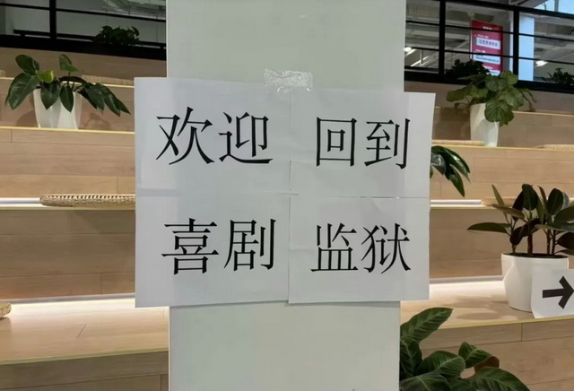 “欢迎回到喜剧监狱”——这八个大字赫然贴在米未公司大厅的立柱上,成为人来人往的“打卡景点”。不少喜人会在这里轮番拍照留念,也包括马东。