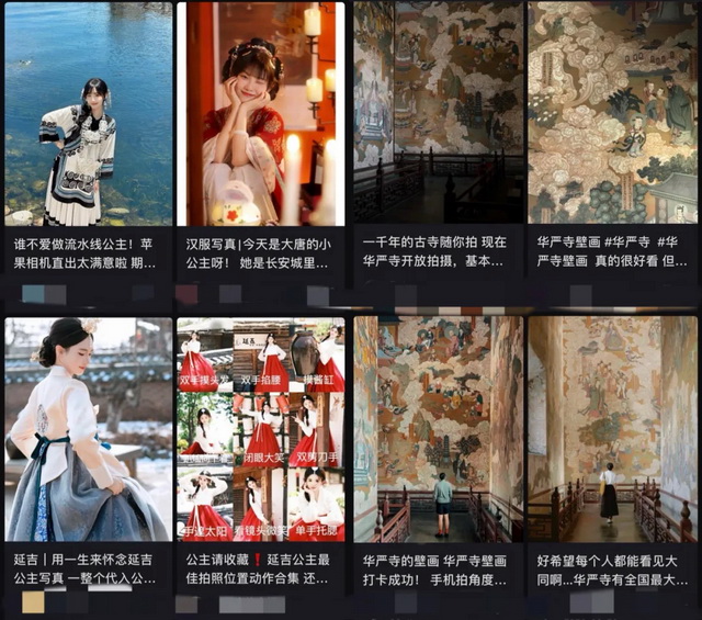 此外,由于站内浓厚的用户分享氛围,小红书的“打卡效应”也非常明显。比如2023年小红书用户分享的山西华严寺普光明殿壁画的拍照攻略,迅速引起站内用户对山西华严寺的兴趣,大批用户前往拍照打卡点,与千年壁画来上一张合影。