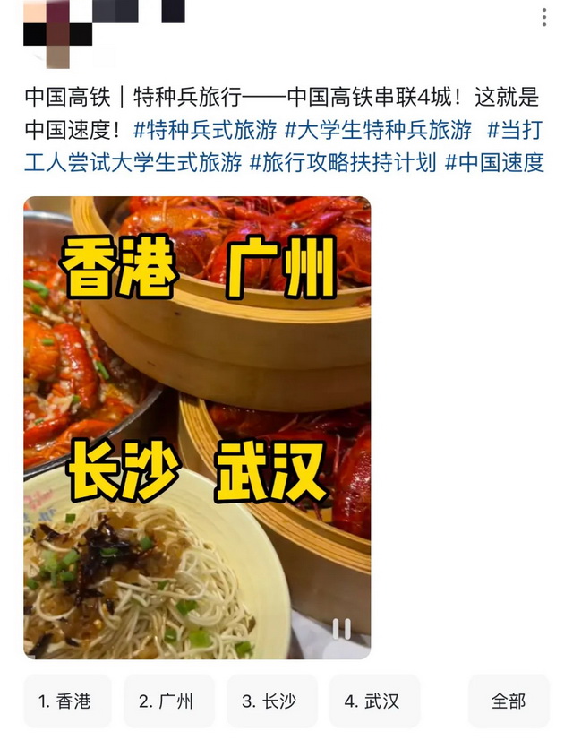 在抖音上,旅游可以不用“出片”也不用很精致,但必须要“快”。前文提到的“特种兵旅游”已经满足不了现在的网友,“24小时游4城”成了博主们的新选题,有博主“24小时吃遍香港、广州、武汉、长沙”,也有博主“24小时极限打卡成都、贵阳、重庆、贵州”。