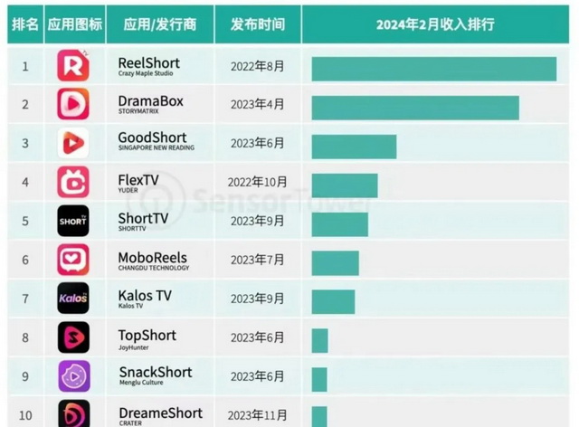 2024年2月海外市场短剧应用内购收入榜,《Reelshort》领跑(数据来源:SensorTower)