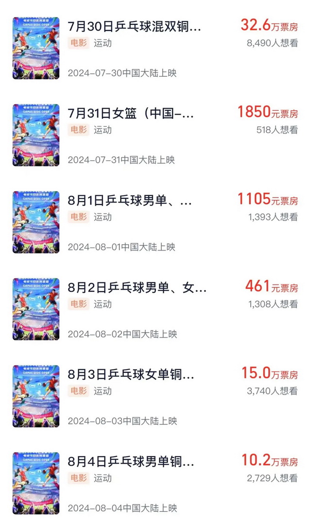 根据灯塔专业版数据显示,目前奥运直播的项目之中,最高票房是开幕式213.6万,其它项目的票房只有几万,最低的是8月2日的乒乓球男单、女单半决赛仅有461元的票房。在这种低迷的数据面前,很难支撑起影院对于活动的投入程度。