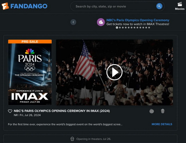 今年6月,AMC影院宣布跟NBC达成合作,从7月27日至8月11日期间,在全美约160家影院播放2024年巴黎奥运会,整个直播活动从上午11点到下午2点不同时间开始,预计每天播放4个小时,观众可以通过AMC官网或者线下进行购票。