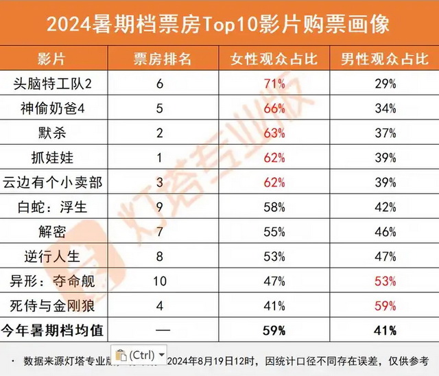 从观众构成上也不难解码几部“种子选手”失利的原因。比如,女性观众在大盘中的占比一直处于更重要的位置,但几个“种子选手”在女性观众中都不够受欢迎。据灯塔专业版截至8月19日的数据,女性观众占比最高的是《头脑特工队2》《神偷奶爸4》《默杀》,而《解密》《逆行人生》的女性观众占比均低于暑期档均值。能够异军突起的《异形:夺命舰》,也依赖女性观众的进场,占比达到47%,远高于好莱坞真人进口片均值。