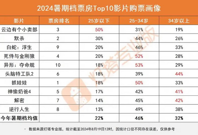 年轻观众一直是电影市场最需要招徕和培养的观众,暑期档做得很差。25岁以下观众占比最高的是《云边有个小卖部》和《默杀》,二者以50%和30%的占比一骑绝尘。而像《抓娃娃》《解密》《逆行人生》等影片,均跌至18%以下。