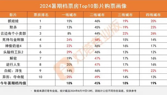 最关键的数据维度还是下沉市场,下沉市场早已成为电影票房的中流砥柱。今年暑期档的票房前三名《抓娃娃》《默杀》《云边有个小卖部》均在三四线城市表现突出,占比高于大盘,再次强调了“得下沉市场者得天下”的结论。