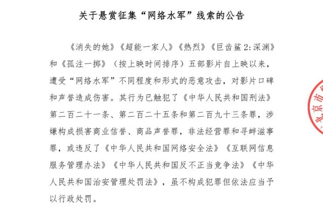 大部分片方有两种回应方式,一种是指责水军作祟。从去年暑期档,就有五电影联合抵制网络水军的公告发出,毒眸也撰文(点此阅读《五电影联合“开炮”水军,有用吗?》)分析过,不管最后能不能抓到水军,单纯从传播效果来说这则声明是完全负分的,大部分网友在评论中误以为这五部电影“不接受批评”,反而进一步把自己置于不利的位置。