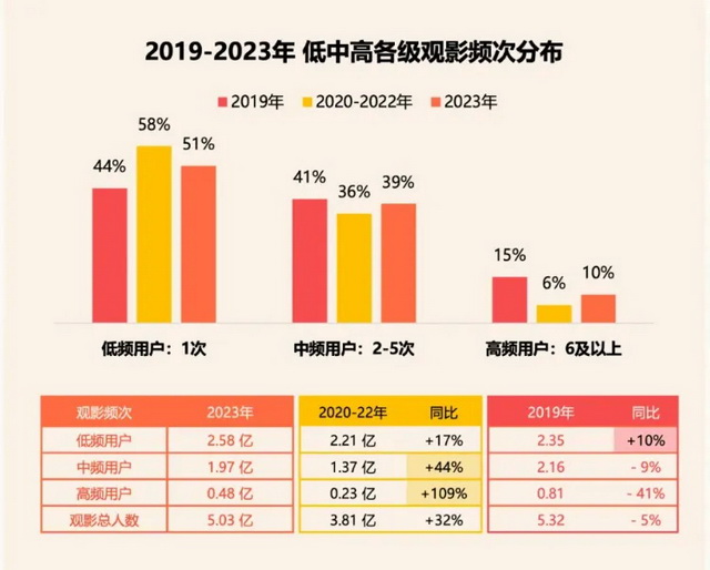 高频用户的数量下滑(图源:灯塔《2023中国电影市场年度盘点报告》)