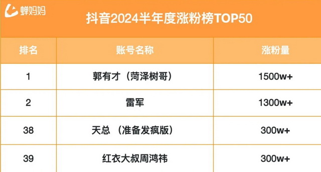 其中,雷军、周鸿祎最具代表性。据蝉妈妈数据,雷军、周鸿祎分别位于抖音2024半年度涨粉榜Top2和Top39,他们的成绩也不仅限于抖音。