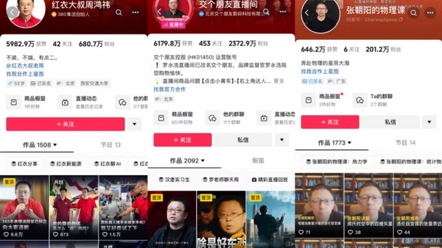 一种是观点型,比如周鸿祎从“红衣大炮”到“红衣大叔”,将“怼”发挥到底,主打一个观点输出。一种是戏精型,比如罗永浩说脱口秀、上综艺、直播上演“真还传”,张兰曝儿子汪小菲与大S的家庭八卦,吸引了不少吃瓜群众。还有一种是佛系型,比如张朝阳以“张朝阳的物理课”为账号名称做起物理科普,在B站自21年11月发布以来积累了40w粉丝,抖音也有了200w+粉丝。