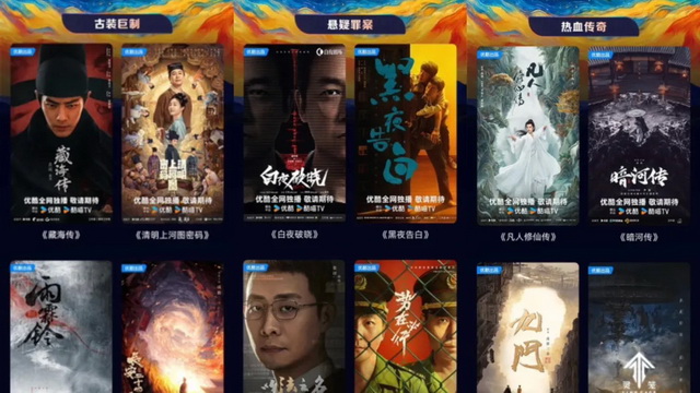 优酷将片单分为了古装巨制、悬疑罪案、都市精品、热血传奇、港剧焕新五大赛道。