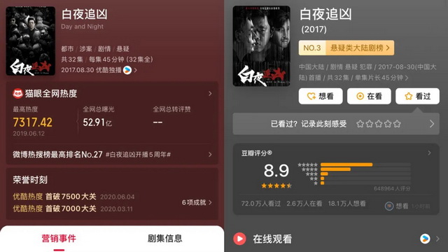 比如备受瞩目的“悬疑白月光”《白夜破晓》,时隔7年终于回归。2017年优酷推出的《白夜追凶》是网剧精品化时代到来的里程碑式作品之一,也在国内首开精品悬疑的先河,72万人在豆瓣打出8.9分的高分。