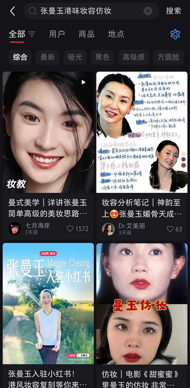 比如张曼玉入驻后,不仅带动了小红书“张曼玉旗袍”“张曼玉港味妆容仿妆”等衍生话题,还让影视片段二创、穿搭审美、女性成长等不同垂类内容都能找到切口,从而在社区内形成一个由明星符号驱动的多层话题矩阵。