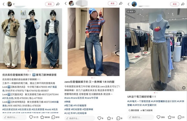 优衣库将弯刀裤摆放在门店最醒目的位置展示,而UR更是一口气推出了几十款弯刀裤产品。运动品牌阿迪达斯、安德玛等都推出了相应产品线。在小红书上搜索神裤,随处可见弯刀裤的单品。