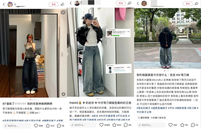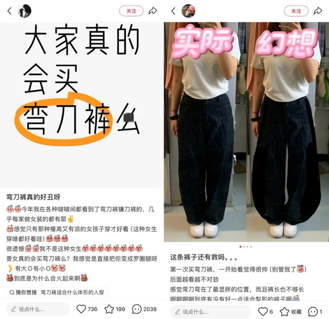 年轻人的穿搭风格也在悄然变化,甚至有人调侃裤子像极了唐老鸭的造型。但这并不影响他们在社交平台上的互动分享,“谁能驾驭弯刀裤?腿短、腿粗能穿吗?”“弯刀裤搭配什么上衣、鞋子?”
