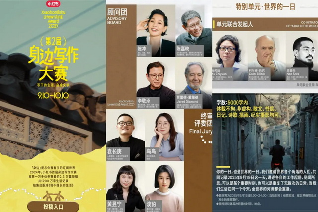 同样是最近,小红书发起了“小红书文学节”,并开启了“第2届身边写作大赛”的征稿和选拔,体裁不拘,字数要求低于5000字,并请来陈冲、陈嘉映、鸟鸟等人组成顾问团和终审评委团,以赛事化的方式吸引更多创作者加入创作。