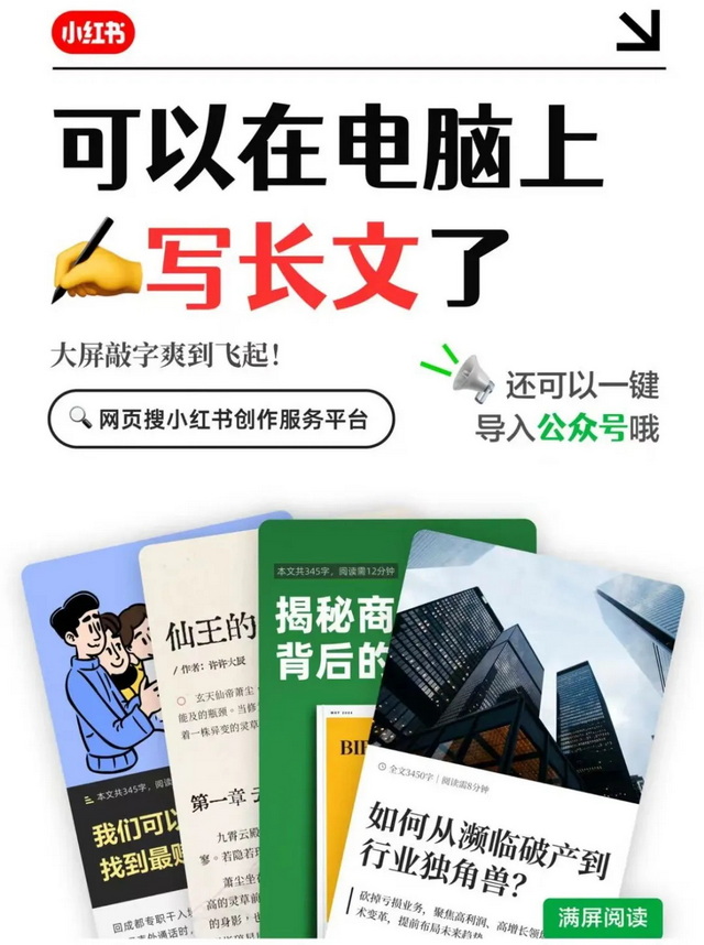 这一趋势,与小红书的产品改进密切相关。过去两个月,小红书陆续取消了此前1000字的字数限制,开始支持单篇6000字的长文创作,并提供自动排版、满屏阅读、一键导入公众号等功能,随后平台又上线了电脑端长文编辑入口,进一步便利了创作者。