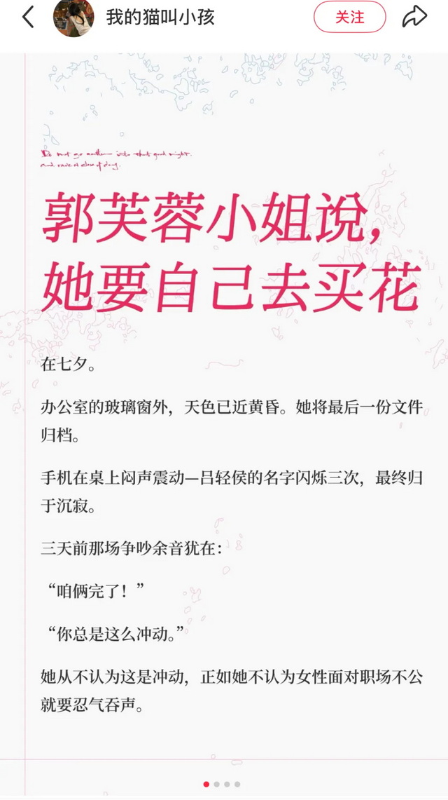 几乎所有与毒眸交流的作者都提到,小红书短篇有更强的女性视角。这直观展现在部分短篇标题中——比如“郭芙蓉小姐说,她要自己去买花”“性转版《聊斋志异》——倒贴仙男爱上落魄的我”“恶女训狗日常”“自卑听障人夫发现你出轨后”。