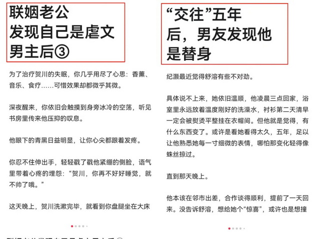 在毒眸看来,小红书网文是知乎短篇故事后,一次更极致的网文短篇化。不仅篇幅走向千字级别,同时文本的情绪服务能力进一步炼化,传统的网文套路、反套路、梗,与小红书基于海量内容生成的细分话题、标签,碰撞、融合,诞生了精确到定制化的网文,实现了雷点细分、癖好细分。