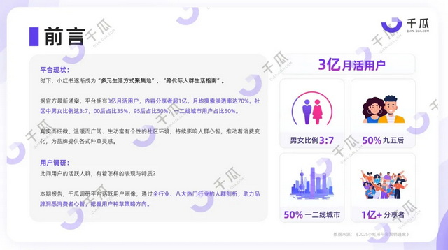 从直观的用户画像来看,据千瓜数据发布的2025小红书活跃用户研究报告,平台拥有3亿月活用户,内容分享者超1亿,月均搜索渗透率达70%。社区中女性用户占比约71.98%,高线城市的青年女性是最活跃的群体。