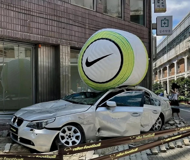 早在社媒尚未兴起的2004年,Nike就曾在泰国曼谷街头使用过用巨型足球砸坏汽车、建筑物的创意,今年8月Nike故技重施,在韩国首尔街头打造了一个场面更大的足球坠毁灾难现场。