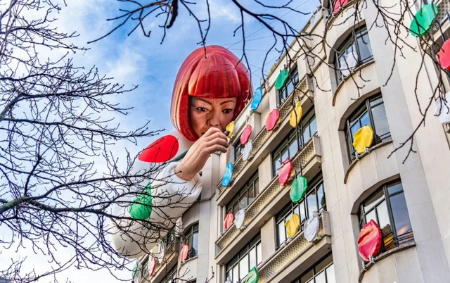 同样沉迷“微物巨化”的还有顶级奢侈品大牌LV。2023年,LV与日本艺术家草间弥生合作期间,在巴黎香榭丽舍大街旗舰店外墙设置了巨型草间人像装置。过去几年,它还多次将巴黎、纽约的旗舰店改造成巨型LV旅行箱。今年,这一手法又被复制到上海静安兴业太古汇前,长114.5米、高30米的LV巨轮成为社交平台的必打卡地标。