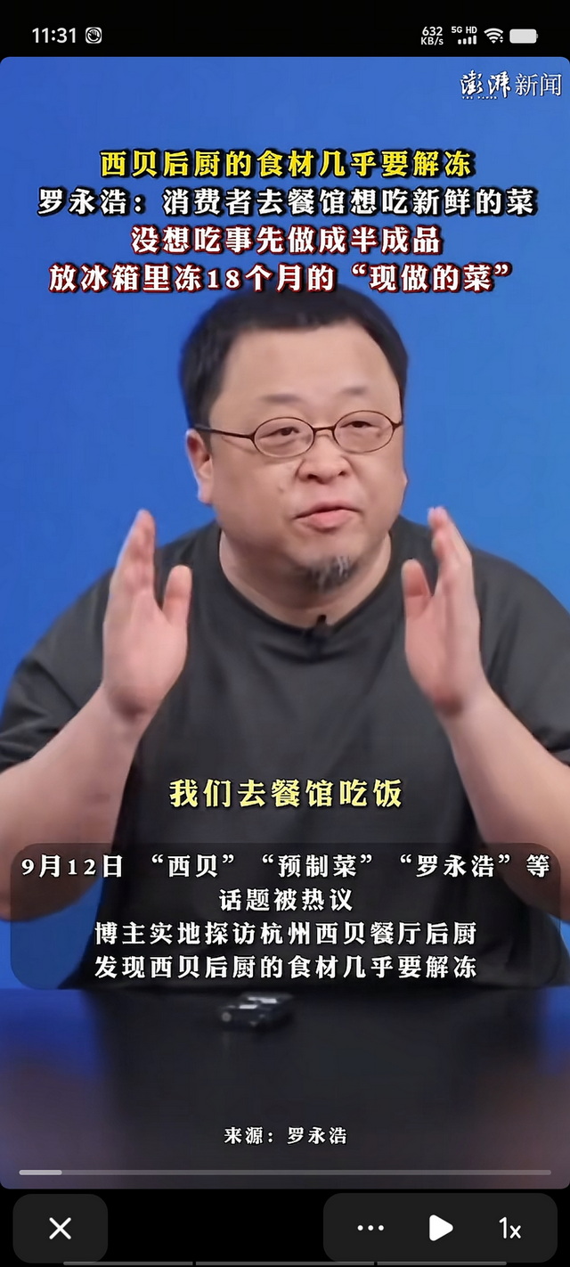 2025 年 9 月 10 日,罗永浩在结束商务行程后与同事前往西贝门店用餐,餐后通过个人微博发布消费反馈:“许久未吃西贝,没想到现在几乎全是预制菜,价格还那么高,太恶心了”。除了表达不满,他还呼吁国家立法强制饭馆注明是否使用预制菜,直指 “餐厅卖预制菜不标注本质就是欺骗”。