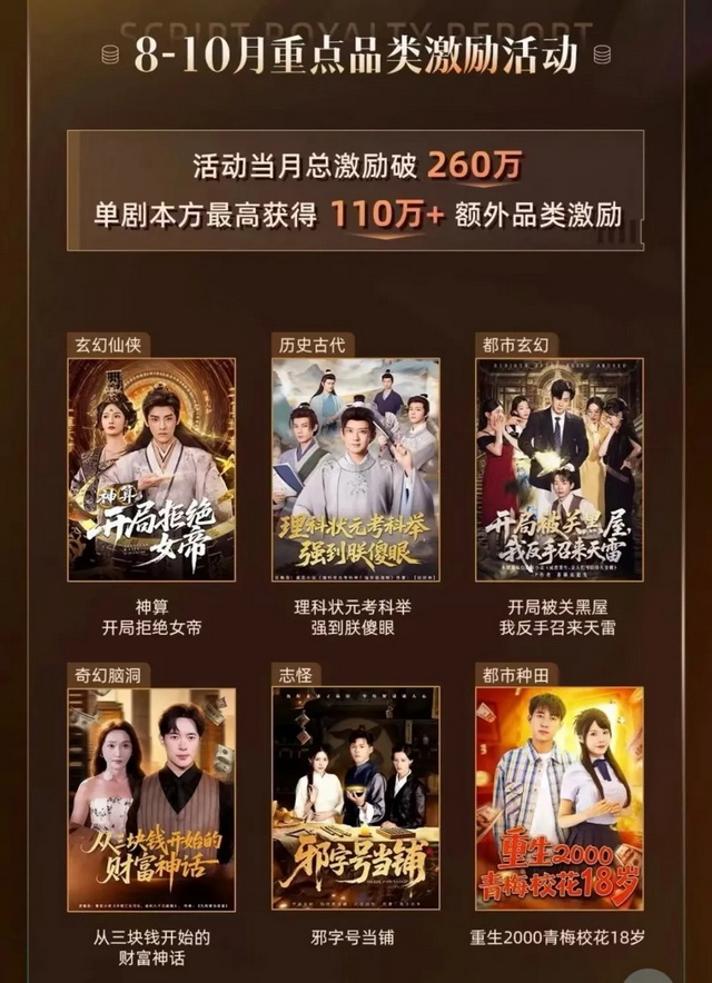 当然,男频短剧的复兴,与短剧如今的话事平台红果短剧的大力补贴脱不开干系。今年9月红果公布的“8-10月重点品类激励活动”,明确对历史古代、玄幻仙侠、悬疑犯罪、都市玄幻、都市种田和奇幻脑洞等六大品类,进行为期2个月的专项分账激励。