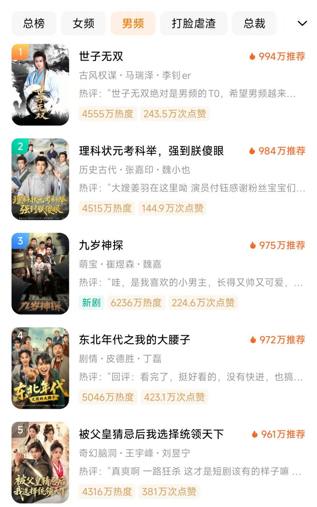这六类题材几乎全部覆盖了典型男频的类型矩阵,可以视作平台在女频占据绝对优势后的一次结构性补位调整。也正因为这轮激励,近期红果的热播榜、推荐榜上出现了更多男频作品,它们的强势露出与分账政策的引导形成了相互强化的效果。