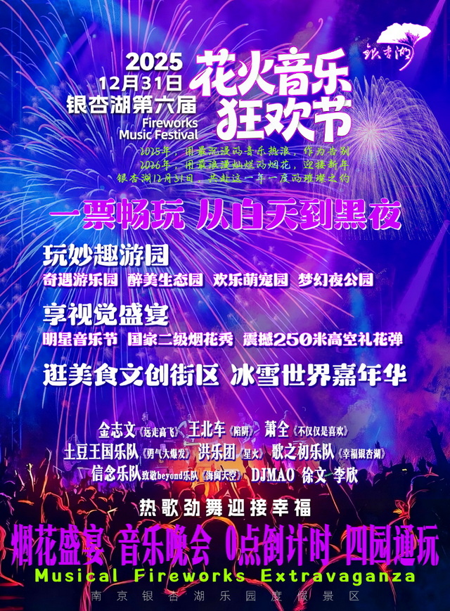 作为南京跨年的标志性活动之一,银杏湖花火音乐狂欢节已成功举办五届,每一届都以震撼的演出和浪漫的氛围成为市民游客的跨年首选。本届音乐节在阵容配置上再度升级,集结了多位覆盖不同年龄段喜好的实力唱将。其中,凭借《远走高飞》火遍全网的金志文将带来经典金曲演绎,王北车的《陷阱》则将唤醒青春记忆,萧全的《不仅仅是喜欢》、土豆王国乐队专为亲子家庭准备的《勇气大爆发》,以及信念乐队致敬Beyond的《海阔天空》等曲目,将让现场观众沉浸式感受多元音乐魅力。此外,洪乐团、歌之初乐队将带来暖场表演,歌之初乐队专为银杏湖定制的《幸福银杏湖》更有望引发全场大合唱,DJ MAO则将用动感节奏点燃全场氛围。