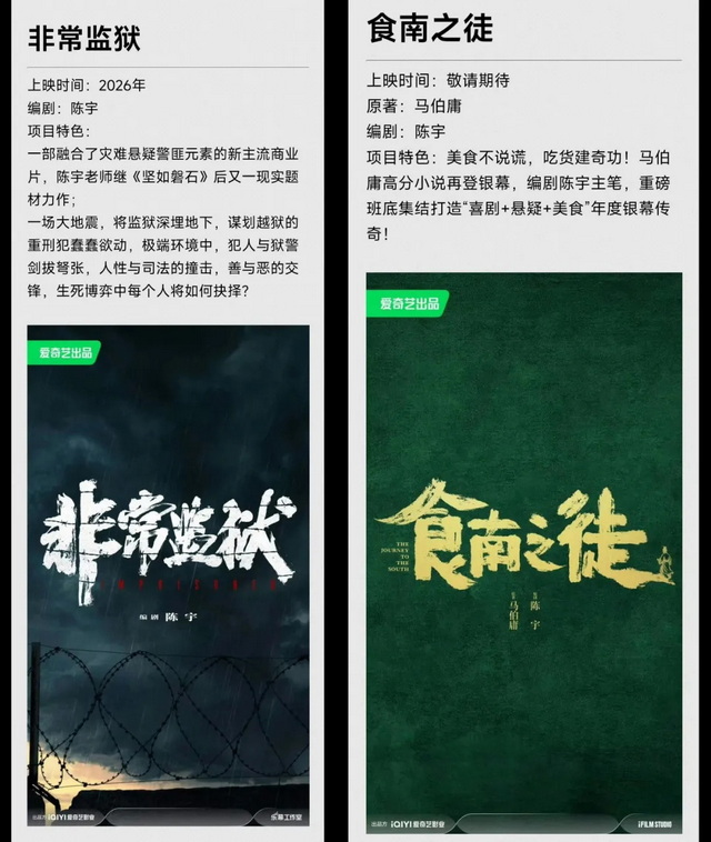 把握市场趋势基础上,接连出品了《捕风追影》和《不说话的爱》的爱奇艺,类型片储备已形成强势布局。悬疑警匪片《非常监狱》由“类型熟手”曹保平执导,改编自马伯庸同名小说的《食南之徒》,悬疑+美食喜剧的定位,在古装片中独具一格。