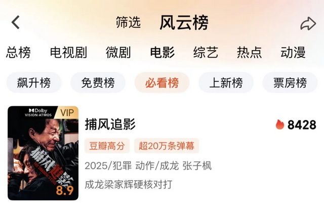 以《捕风追影》为例,该片上线后引发二次观影热潮,正片有效播放市占率连续7天位列院线电影全网榜和电影全网榜TOP1。影片质量也获得爱奇艺会员认可,《捕风追影》热度超过8400,成为继《哪吒2》之后,2025年院线电影爱奇艺内容热度峰值排名第二的影片。