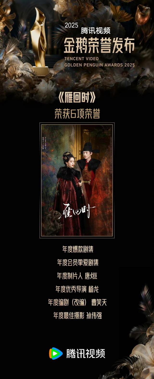 此次凭借《雁回时》获得年度编剧(改编)荣誉的曹笑天,也并非第一次与腾讯视频结缘。此前他就曾与腾讯视频合作古装悬疑剧《九义人》,在《雁回时》剧本前期改编阶段,腾讯视频制片人向合作团队推荐了曹笑天。从口碑积累到市场突破,《雁回时》实现了热度与口碑的双重爆发,不仅成为年度爆款剧集,也荣获2025金鹅荣誉“年度会员挚爱剧集”。