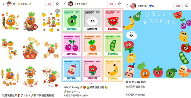 从IP的内部生长机制来看,MOJO FAMILY的第一位成员“卜卜”诞生后,又接连交到了很多“好朋友”,比如四处流香香蕉哥、野蛮的甜青苹果、鸭梨大小姐、红得发紫樱桃姐妹等等,每个形象都有各自的性格,还有围绕特殊时间节点或城市基因而诞生的窝心暖暖金多虾、人见人爱南瓜贝贝、糖葫芦等等。同时,“卜卜”也在生日、圣诞节、新年等特殊时间节点有形象上的变化。在保持情绪价值不稀释的基础上,通过内容版图的扩充持续引发新鲜感,是IP具备长期性的关键。