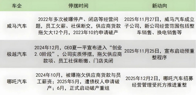 此外,威马、极越、哪吒等陷入困境的车企,还没彻底退场,正在积极通过重整、成立新公司等方式寻求“重生”。