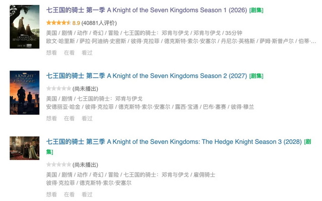 《七王国的骑士》设定在《权游》故事发生前的一个世纪,与《龙之家族》一样,是《权游》的前传剧集系列。据尼尔森和华纳兄弟探索(HBD)的数据,《七王国的骑士》在美国平均观众超过1400万,全球观众达2600万,imdb评分8.8分,成为《权力的游戏》IP继《龙之家族》后又一成功的衍生剧。