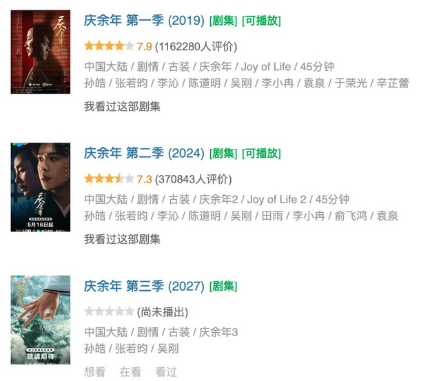 但问题在于,IP的价值从来不体现在拥有,而体现在如何兑现,且持续兑现。在国内的影视产业中,最接近衍生剧开发的模式是像《庆余年》这样的季播剧,以及近两年小范围流行起来的长剧衍生短剧,距离真正的独立衍生剧,仍然有很长的产业距离。