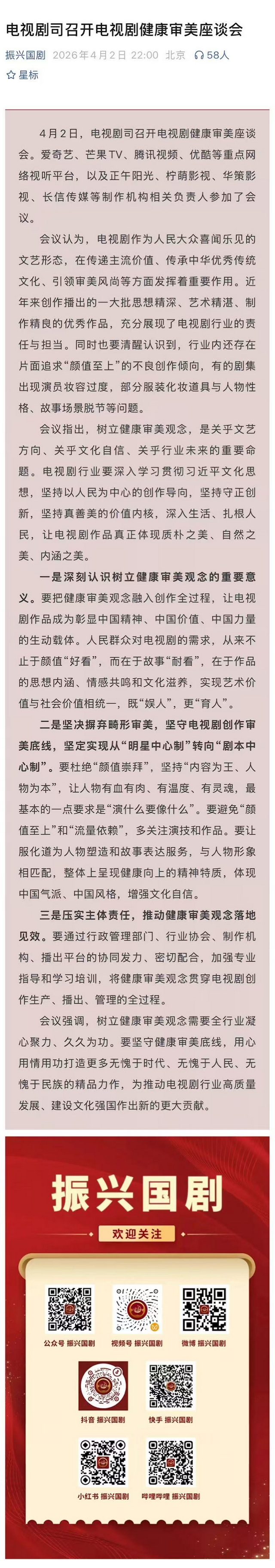 这场座谈会给出的答案清晰而有力:摒弃畸形审美,回归质朴、自然、内涵之美;告别“明星中心制”,走向“剧本中心制”;让电视剧从“娱人”走向“育人”,从“好看”走向“耐看”。