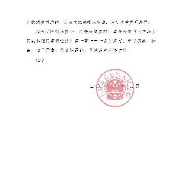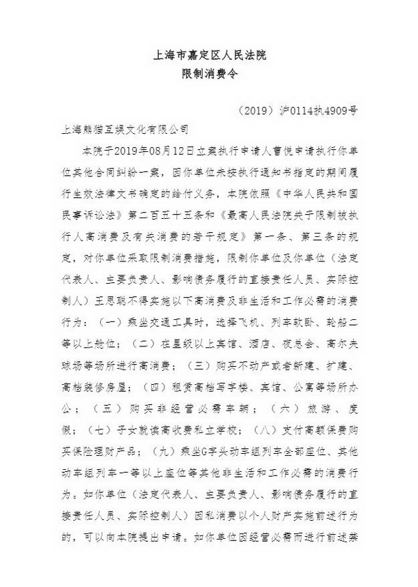 据中国执行信息公开网消息,王思聪已被上海市嘉定区人民法院发布限制消费令。上述限制消费令显示,法院于2019年08月12日立案执行申请人曹悦申请执行上海熊猫互娱文化有限公司其他合同纠纷一案,因熊猫互娱未按执行通知书指定的期间履行生效法律文书确定的给付义务,被采取限制消费措施,限制其法定代表人、主要负责人、影响债务履行的直接责任人员、实际控制人王思聪不得实施高消费及非生活和工作必需的消费行为。