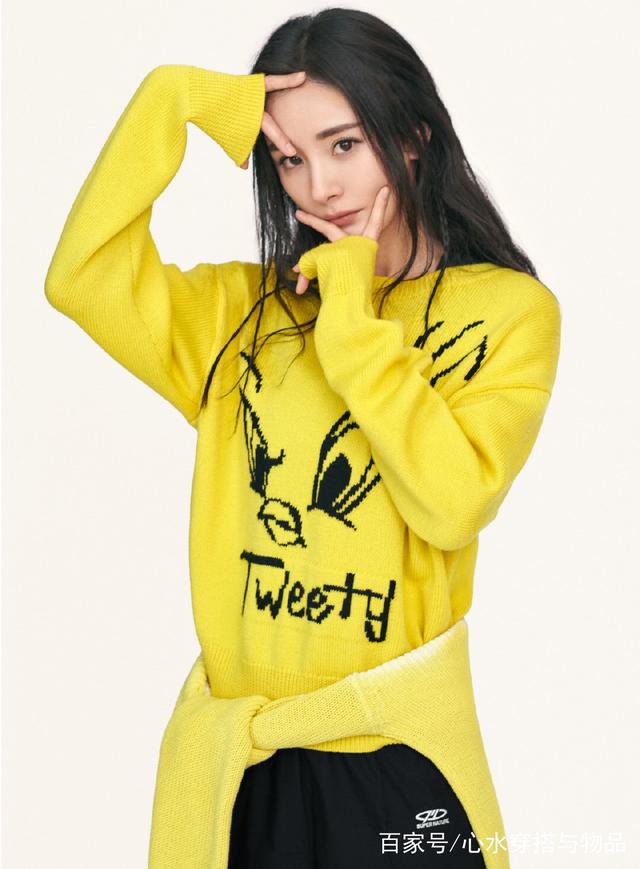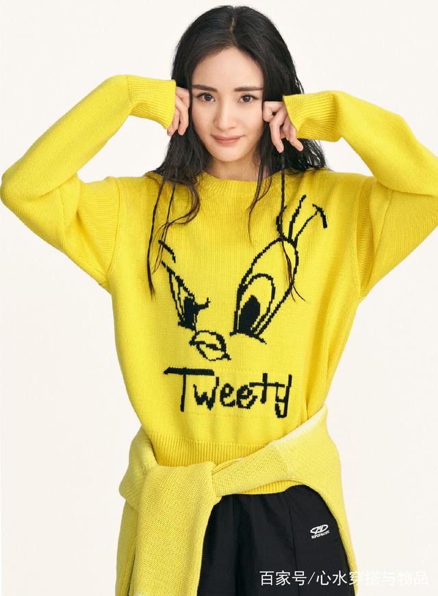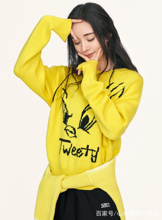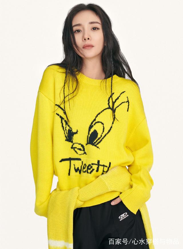 带货女王上线营业,身穿MO&Co. | LOONEY TUNES合作系列,黄色毛衣,元气满满的四连拍甜中带酷。