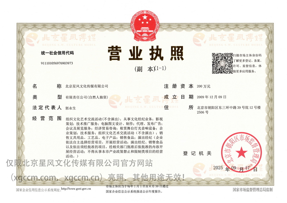经营范围:组织文化艺术交流活动(不含演出);从事文化经纪业务;影视策划;技术推广服务;电脑图文设计、制作;代理、发布广告;会议及展览服务;经济贸易咨询;租赁舞台灯光音响设备;企业策划;技术服务;组织文化艺术交流活动(不含演出);销售文具用品、工艺品、电子产品;销售食品;演出经纪(企业依法自主选择经营项目,开展经营活动;演出经纪、销售食品以及依法须经批准的项目,经相关部门批准后依批准的内容开展经营活动;不得从事本市产业政策禁止和限制类项目的经营活动。)