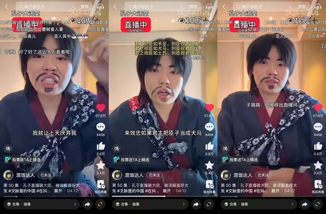 于是,在《孔子直播破大防,被误解直呼太冤》中,@混饭达人 cosplay成“孔子”,上演了孔子开直播的场景,弹幕内容正是模拟真实网友的提问。