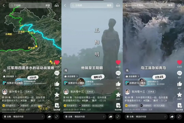 无独有偶,在「文脉里的中国」最新一期的贵州站中,@东兴苟十三、@李右溪 、@贵州文旅 等32位创作者和贵州各地媒体,共同以贵州文化为脉络共创了一期视频,展开讲解了贵州的红色文化、阳明文化、民族文化、屯堡文化等文化。