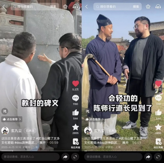 以口播为主的文化创作者@玄九尘 ,在湖北十堰武当山站一期视频中也罕见去往线下。他以第一视角展开,通过记录与武当道长的互动,实地解读武当山道教、历史、武术、建筑等多元细节,增强用户的体验感。