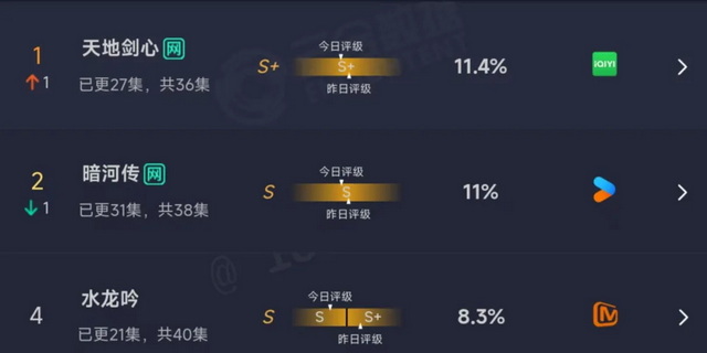 《天地剑心》《暗河传》《水龙吟》云合数据(图源:云合工具)