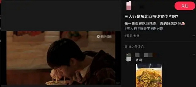 剧中校门口的麻辣烫,出现频次之高,让小红书上不少观众将《三人行》戏称为“麻辣烫宣传片”“恋与麻辣烫”。这也是蔡雨潮给贺羽端形容的:有麻酱,黏黏糊糊的,带汤。打包回学校怕被查,还得偷偷摸摸放黑袋子里。