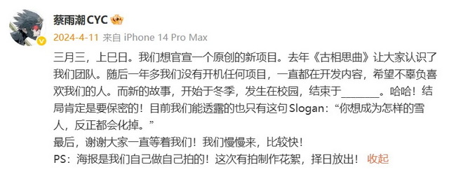在三个人的相处过程中,连荀未来和赵了的“正确”都有些动摇了。到底什么才是最重要的?后悔药就这么好吃吗?在2024年的“三月三,上巳日”,这个《古相思曲》中男女主每次重逢的时间,蔡雨潮在微博发布了新项目《三人行》的消息,公开了剧集的slogan:“你想成为怎样的雪人,反正都会化掉。”