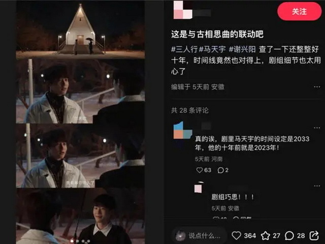 而喜欢朝也影视作品的观众,似乎也已经逐渐发现了类似于在开放世界解谜的乐趣。不少人把《三人行》和《古相思曲》联合起来一起解读,比如荀未来穿越回去找赵左右的时间刚好是2033年,与《古相思曲》播出的年份差了十年——这正是《古相思曲》中男女主角在逆向穿越的时空里,每一次相遇的间隔时间。