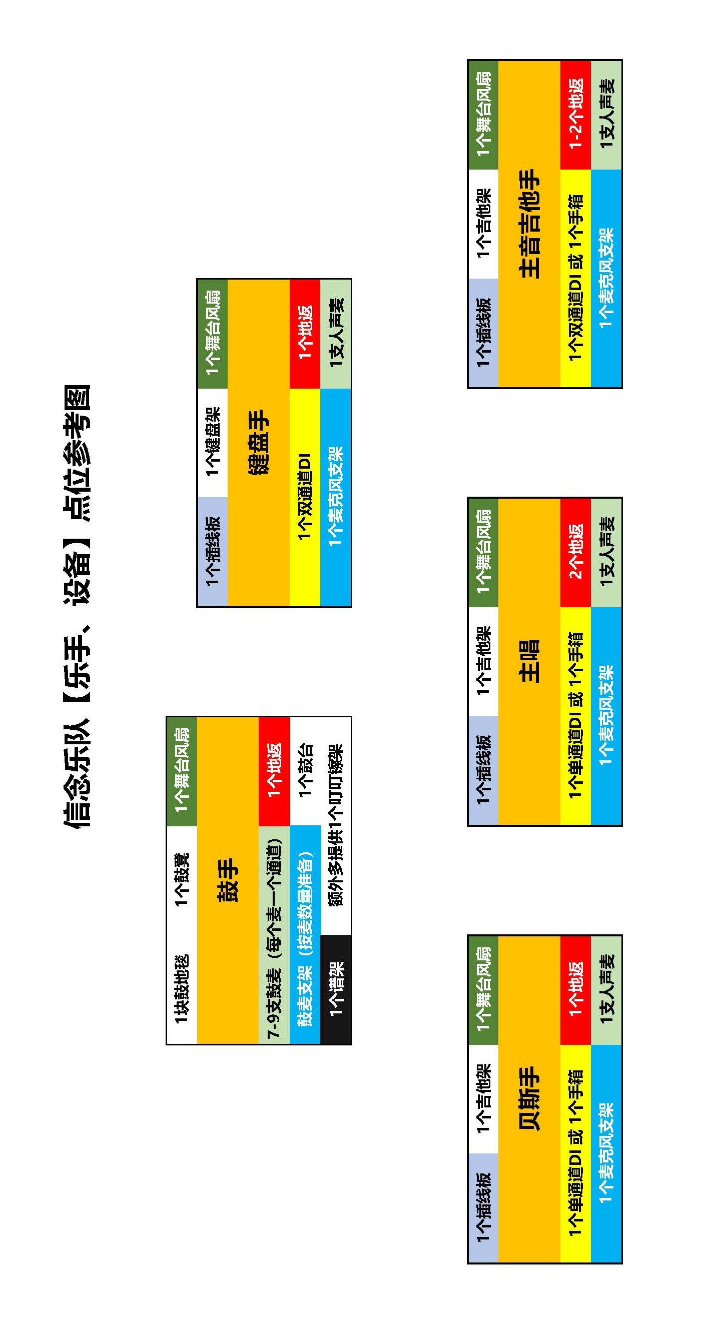 乐队自带:吉他、贝斯、键盘、吉他效果器、贝斯效果器、自带8根双头6.5mm乐器连接线;其他需舞美方准备